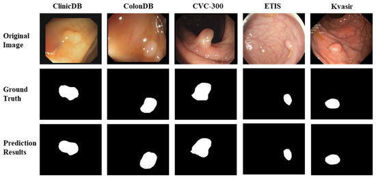 In addition to the comparison with the four existing models—U-Net, U-Net++, SFA, PraNet in Figure 3—on the Kvasir dataset, we also tested our model on the other four datasets (CVC-300, CVC-ClinicDB, CVC-ColonDB, ETIS-LaribPolypDB,). The results are shown in Figure 4. From Figure 4, our model (MugenNet) can accurately locate the position and size of polyps on the five different datasets. The results show that our model possesses stable and good generalization ability.