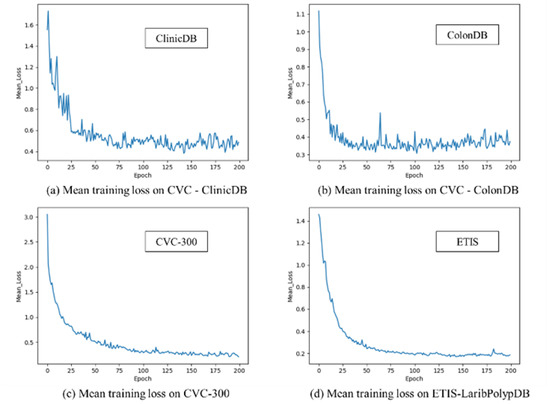 The loss function was defined as during the training process, according to [32,34], where was the global weighted average loss (added to the global constraint) and was the weighted binary cross entropy loss (added to the pixel level constraint). Further, n was a hyperparameter used to allocate the proportion of the loss and the loss in the total loss L. Compared with the standard loss, which is commonly used in the segmentation tasks, the global average loss highlights its the importance of complex sample pixels by increasing the their weight of the complex sample pixels. At the same time, the weighted binary cross entropy loss pays more attention to the complex sample pixels, which can effectively extract the pixel-level edge features at the pixel level. Considering that the goal of the model was of the colonic polyp segmentation and the edge features were not obvious, we took set n to be to increase the proportion of the pixel-level constraints in the overall total loss function. was up-sampled to the same size as the ground-truth graph image G. The proposed overall-loss function of MugenNet for colonic polyp detection can then be expressed by: