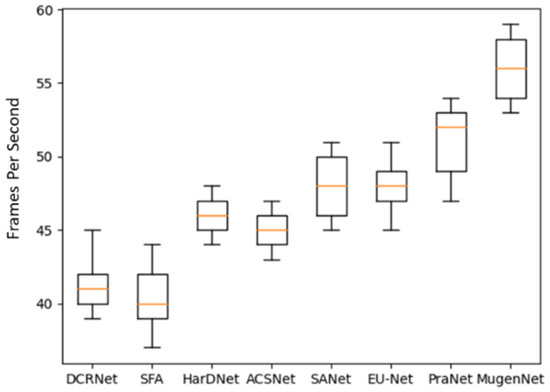 We tested the Frames Per Second () of ten models on the training dataset to evaluate the inference speed of the models, as shown in Figure 6. Since the FPS of U-Net and U-Net++ are both below 10 (as shown in Table 6), their inference speed is too slow; hence, they are not shown in Figure 6. It can be observed from Figure 6 that the average of our model reaches 56. It is noted that when is greater than 30, the model was considered reasonable for video streaming data [43]. It can be seen from Figure 6 and Table 6 that our model (MugenNet) has advantages in processing video stream data for the colonic polyp image segmentation.