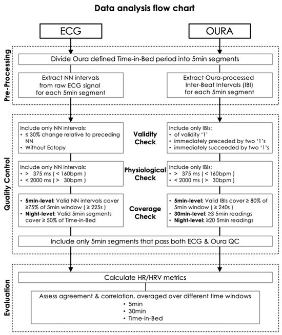 ECG waveform analyses were conducted in MATLAB (R2021b; The Math Works, Inc., Natick, MA, USA). Oura IBI processing, HR and HRV calculation, and statistical comparisons were performed in RStudio (version 2023.12.0+369). As the Oura Ring’s efficacy as a standalone device for cardiovascular monitoring during sleep is being evaluated, for the current analyses, the start and end of sleep periods were defined using Oura-assessed bed- and wake times, which have been shown to be highly accurate when compared against PSG [33,34]. The Time-In-Bed period (TIB) was divided into 5 min segments for comparing HR and HRV metrics derived from ECG normal-to-normal (NN) and Oura IBI signals. Before further analyses, both time series were checked for: (1) validity of each NN or IBI reading; (2) physiological plausibility during sleep; and (3) validity proportion for each 5 min segment (Figure 2).