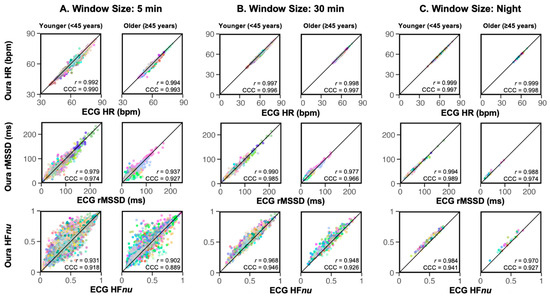 Scatter plots showing correlations between Oura IBI-derived measures and ECG-derived measures separated by age group for different window sizes: (A) 5 min, (B) 30 min and (C) night levels. Validity proportion threshold was set at 80%. Every colour represents one participant within the age group.