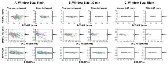Bland–Altman plots showing the agreement between Oura IBI-derived measures and ECG-derived measures (reference) separated by age for different window sizes: (A) 5 min, (B) 30 min, and (C) Night. IDD (inter-device difference) was defined as ECG measures subtracted from the respective Oura measures. The IDD distributions, plotted on the right of each Bland–Altman plot, showed a tight cluster around 0. Results are shown for 80% validity proportion threshold. Every colour represents one participant within the age group.
