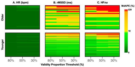 MdAPE was calculated for each participant’s 5 min level HR/HRV readings at different validity proportion thresholds and visualized as heatmaps (Figure 5; MAE and MAPE showing similar trends are shown in Supplementary Materials Figures S1 and S2), with every individual row as one participant. Within each heatmap per age group, the individual rows were arranged in descending order of mean MdAPE across all validity proportion thresholds.