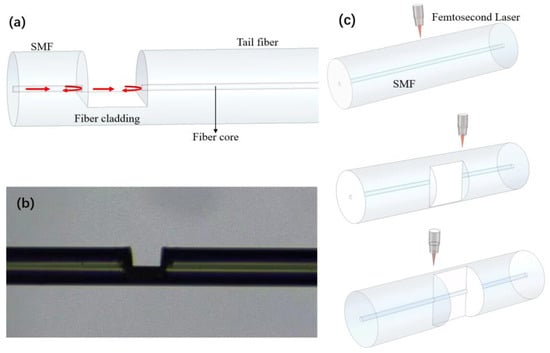 The structure of our proposed sensor is shown in Figure 1a. The sensor is fabricated by removing part of the fiber material of a single-mode fiber using femtosecond laser ablation to form an in-fiber FP cavity. Fiber tails with a length of several millimeters are left on the far end of the FPI, which act as cantilever beams of the sensor. The incident light is reflected by the two mirrors of the FPI, as shown in Figure 1a, which leads to interference in the reflection spectrum. The interference spectrum is determined by the cavity length of the FPI, which can be affected by vibration. Figure 1b shows the microscope image of a fabricated sensor. The fabrication process of the sensor is shown in Figure 1c.