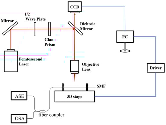 Figure 2 illustrates the experimental set up for the fabrication of the in-fiber cavity. A Ti:sapphire Femtosecond laser (Spectra Physics, Irvine, CA, USA, Solstice, λ = 800 nm, 100 fs, 1 kHz) is used to fabricate the sensor. The power of the laser is tuned by a halfwave plate followed by a Glan lens. Laser pulses with a pulse energy of 20 μJ is focused on the fiber through a 10×, NA = 0.25 objective lens (Nikon, Tokyo, Japan) with a working distance of 7 mm, as illustrated in Figure 2. A CCD camera is used to monitor the fabrication process in real time. A standard single-mode optical fiber (YOFC, Wuhan, China) is fixed on a high precision translation stage with a resolution of 50 nm. The translation stage is controlled by a computer to move along the fiber length at a speed of 20 µm/s, while part of the fiber material is ablated by the focused laser. After each ablation cycle, the focusing point is moved closer to the fiber core with a distance of 1 µm, before the next cycle. An in-fiber cavity of the desired length and depth can be created in the single-mode fiber after several cycles of laser ablation. Then, the femtosecond laser is used to clean the debris on the mirror, which could increase the reflectivity on interfaces, and further lead to higher fringe visibility in the reflection spectrum. Finally, the far end of the fiber is cut to leave a fiber tail with certain length to complete the sensor sample. Samples with different cavity depths (75, 70, and 65 µm), and different fiber end lengths (15, 10, and 5 mm) are fabricated experimentally.