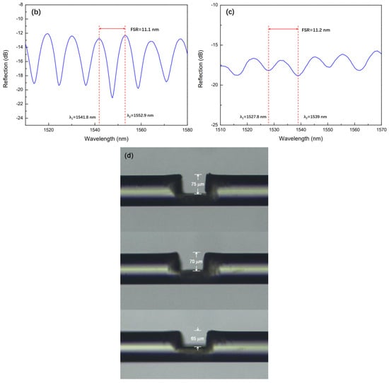 The reflectance spectrum of the sensor is measured by an amplified spontaneous emission (ASE) light source with wavelength ranging from 1540 nm to 1600 nm and an optical spectrum analyzer (OSA, YOKOGAWA, AQ6370C, Tokyo, Japan) through an optical fiber coupler. Figure 3a shows the reflection spectrum of the sensor with a cavity depth of 75 µm. It can be seen that the reflection spectrum has a high fringe contrast. Similarly, we also tested the reflectance spectra of sensors with cavity depths of 70 and 65 µm, and the test results are shown in Figure 3b,c. As can be seen from the figure, the contrast of the reflection spectrum of the sensor with a cavity depth of 70 µm is slightly lower compared to the sensor with a cavity depth of 75 µm. That is because the sensor with depth of 75 µm has higher reflectivities at both reflection mirrors. As for the sensor with a cavity depth of 65 µm, the fringe contrast is the lowest among the three samples, since only part of the core is removed, resulting in only a portion of the incident light taking part in the FP interference. The microscope images of these samples are shown in Figure 3d.
