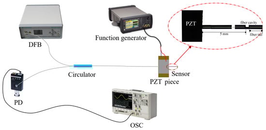 We set up an experimental platform for vibration measurement to verify the feasibility of this sensor for vibration sensing. As shown in Figure 4, we fixed the cavity vibration sensor on a piezoelectric ceramic (PZT) with glue. Considering that the orientation of the cavity has direct influence on the vibration sensing, the cavity is oriented to the oscillation direction of the PZT to achieve better sensitivity. The distance from the fiber cavity to the edge of the PZT is 5 mm, as shown in the inset of Figure 4. The PZT is connected to a function generator (KEYSIGHT, Santa Rosa, CA, USA), which is used to control the vibration signal. The cavity is fixed 5 mm away from the edge of the PZT, as shown in Figure 4. The sensor is connected to the optical circulator; the other two ends of the optical circulator are connected to a DFB Laser and a photodetector (PD). The PD converts the optical signal into voltage signal, which is collected by an oscilloscope (KEYSIGHT) for observing the vibration signal.