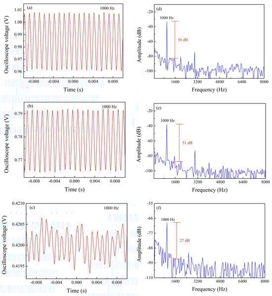 Time domain diagram (a–c) and frequency domain diagram (d–f) of sensors with cavity depths of 75, 70, 65 µm for a frequency of 1000 Hz and a voltage amplitude of 10 V.