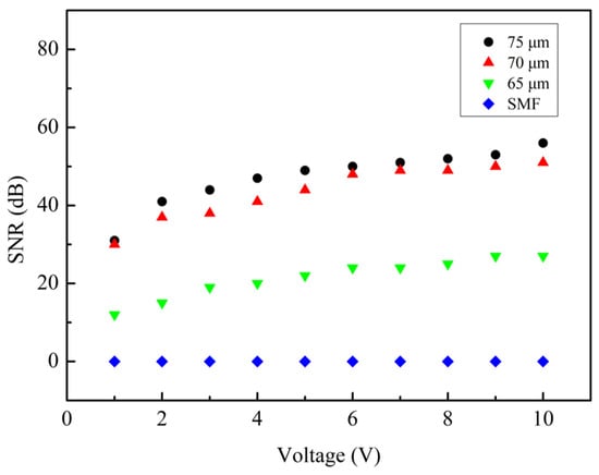 The SNR of sensors with cavity depths of 75, 70, and 65 µm, when the voltage is adjusted from 1 V to 10 V (the frequency is 1000 Hz).