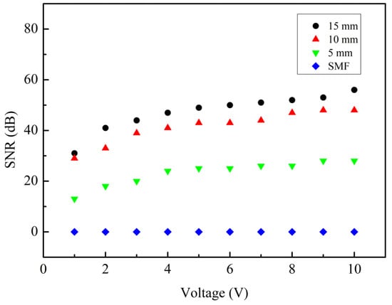 The SNR of sensors with tail fiber lengths of 15, 10, and 5 mm, when the voltage is adjusted from 1 V to 10 V (the frequency is 1000 Hz).