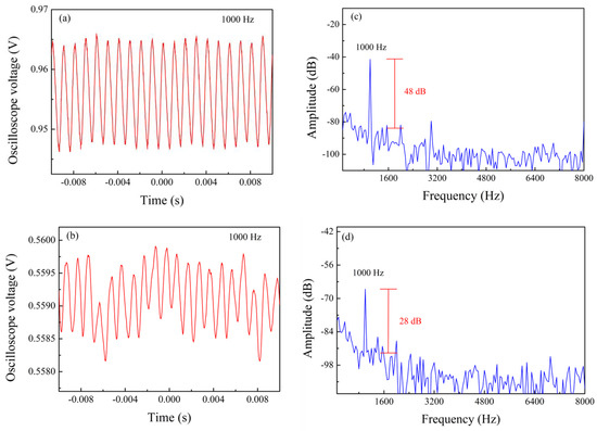 Time domain (a,b) and frequency domain (c,d) of sensors with tail lengths of 10 mm and 5 mm when the frequency is 1000 Hz and the voltage amplitude is 10 V.