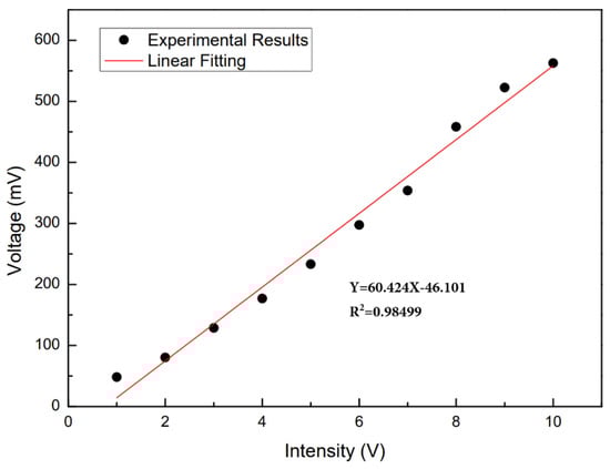 The peak-to-peak value measured under each driving voltage is taken as the output result of the sensor, and the sensitivity characteristic curve of the vibration sensor to the vibration amplitude is shown in Figure 11. Where the horizontal coordinate is the amplitude voltage of the function generator, and the ordinate is the voltage signal output by the vibration sensor. The relationship between the two is linear, and the sensitivity of the sensor is 60 mV/V.