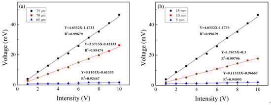 The change in cavity length introduces phase shift in the interference Δϕ = 4πΔL/λ, leading to wavelength shift of the spectrum. According to Equation (4), the mass of the fiber tail affects the vibration of the cantilever beam. From Equation (6), one can also tell that the thickness of the cantilever beam has direct influence on the ratio of the moment of inertia to the mass. In order to study the effect of different structural parameters on sensor amplitude sensitivity, sensors with different cavity depths and tail lengths were tested. First, we tested the amplitude responses of sensors with cavity depths of 75, 70, and 65 µm, respectively, while fixing their tail-length at 15 mm. The frequency of the function generator was fixed at 1000Hz, the regulation voltage range from 1V to 10 V, and the data was recorded every 1 V. Figure 13a shows the sensitivity characteristic curve of sensors with cavity depths of 75, 70, and 65 µm. It can be seen that the amplitude sensitivity of the sensor increases with the depth of the cavity. The sensitivity of a sensor with a cavity depth of 75 µm is 1.8 times that of a sensor with a cavity depth of 70 µm, indicating that the cavity depth has a significant impact on the sensitivity of the sensor.