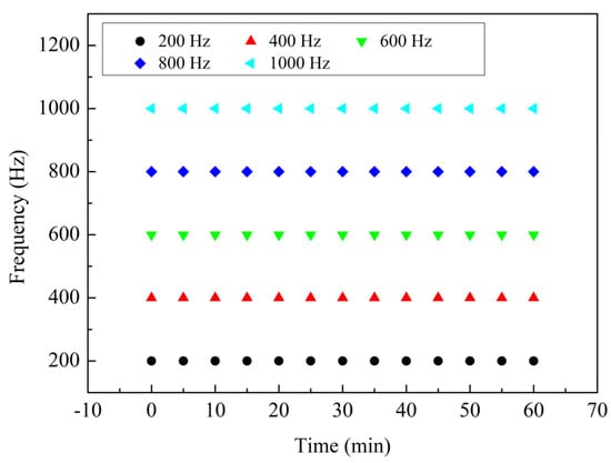 In addition, the stability of the sensor was investigated experimentally. A sensor with cavity depth of 75 µm and tail length of 15 mm was selected for the experiment. During the experiment, other parameters were kept unchanged, and the sensor was vibrated continuously for 60 min at a fixed frequency. The data on the oscilloscope was recorded every five minutes, and then FFT processing was carried out. The frequency range of the stability experiment was 200–1000 Hz, and the interval of the experimental frequency was 200 Hz. The experimental results are shown in Figure 14, from which one can see that the measured values of each frequency are quite stable.