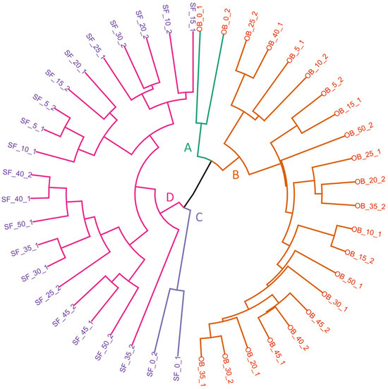 First, the aim was to study whether there was any tendency of the honey samples to be classified according to the botanic origin and/or the level of adulteration based on UF-GC results. To do so, the raw data matrix containing OB and SF honey samples (D44x20002) without applying any pre-treatment was subjected to hierarchical cluster analysis (HCA). Euclidean distances were used to determine the similarity between samples. The linkage method, used to merge or split clusters based on their similarity, was selected by comparing different methods (single, full, average, Ward, and centroid). Since HCA was performed without pre-treatment and concatenating information obtained by both columns in order to understand raw tendencies, values in the linkage method ranged from 0.6216 to 0.7474. The average method obtained the best result (0.7474). The results from HCA are represented in a dendrogram in Figure 1. In general, it can be observed that samples with the same botanical origin are located in related clusters, and the level of the adulteration conditions the location in the dendrogram. The four main clusters identified are A, B, C, and D. The unadulterated samples of OB honey are grouped in cluster A, while unadulterated SF samples are grouped in cluster C. On the other hand, adulterated OB samples are grouped in cluster B and adulterated SF samples are grouped in cluster D. Adulterated SF samples showed a slight trend to cluster by their level of adulteration in subclusters. Nonetheless, this trend was less evident in the case of OB samples.