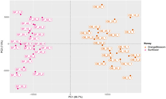PCA was performed to identify differences between OB and SF honey (D44x20002). Figure 2 shows the scores obtained by the samples for the first two principal components (PCs). The first principal component (PC1) and the second principal component (PC2) represented 86.7% and 7.5% of the cumulative variance, respectively, covering 94.2% of the total variance of the dataset. In the score graph (Figure 2), the samples of different botanical origin were distributed in two clearly differentiated areas based on their scores with respect to PC1 and PC2.