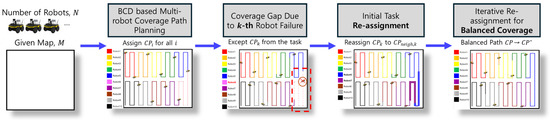 The proposed multi-robot path redistribution method is grounded in the BCD algorithm, where the coverage path of a failed robot is adaptively redistributed to the remaining robots using an iterative reassignment strategy. Figure 1 illustrates the flowchart of the proposed method, which comprises five main stages. Initially, the environment map and the number of robots are provided, with the map being either derived from an SLAM (simultaneous localization and mapping) process or simplified and approximated as a polygonal representation. The BCD algorithm is then applied to generate multi-robot coverage paths that effectively divide the overall environment among all robots. In the event of a robot failure, a coverage gap emerges, as shown in the second stage of the flowchart. The proposed method then enters the third stage, where an initial task reassignment takes place to redistribute the failed robot’s coverage path segments to the nearest robots. The fourth stage involves iterative reassignment, where the remaining robots adjust their paths through propagation to ensure a balanced coverage of the environment. This process continues until the propagation is complete. As a result, the proposed method ensures that the overall mission objectives are maintained efficiently, despite the dynamic changes in robot availability.