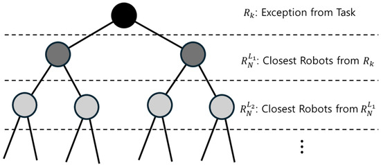 When a robot becomes incapacitated due to factors such as battery depletion or hardware malfunction, a coverage gap appears in its previously assigned path . To effectively resolve this and redistribute the uncovered area to other operational robots, an adjacency tree, T, is constructed with as the root node. As shown in Figure 2, the robots nearest to the excluded robot , denoted as , form the first level of the adjacency tree. Subsequently, robots closest to those in level that have not yet been incorporated into the tree structure form the next level, . This hierarchical process continues, with each successive level consisting of the nearest robots not already included, until all relevant neighboring robots are accounted for. The total number of levels in the tree depends on the configuration and distribution of the coverage paths within the given environment.