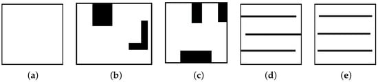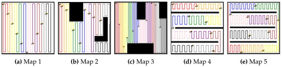 In this study, five different environments were used to evaluate the proposed MCPP and redistribution method, as shown in Figure 3. These environments vary in complexity and coverage challenges, providing a comprehensive test of the algorithm’s performance. Figure 3a represents a simple environment without obstacles, assessing basic coverage efficiency. Figure 3b,c introduce two and three obstacles, respectively, allowing us to evaluate how the algorithm handles obstacle avoidance and path redistribution. Figure 3d,e contain multiple lanes, testing the algorithm’s ability to balance coverage across segmented regions, relevant in scenarios like agriculture or warehouse management. These five simulation environments provide a diverse set of challenges to thoroughly assess the adaptability, efficiency, and robustness of the multi-robot coverage path replanning methods. All robots in the simulation operate at the same travel speed and feature 360-degree omnidirectional navigation. Additionally, with holonomic motion capabilities, the robots are not limited by a turning radius, allowing for greater maneuverability. By evaluating the algorithm across these varied conditions, we demonstrate its capability to handle real-world complexities and ensure reliable performance in different types of environments.