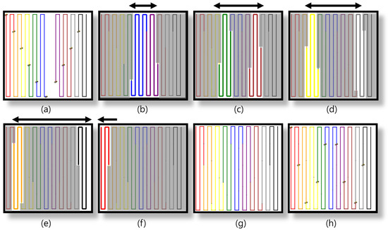 Figure 6 illustrates the sequence of propagation stages following the failure of a robot in a simple open environment. In Figure 6a, the failed robot is excluded (represented as a blank space), resulting in a coverage gap. Figure 6b–h depict the progressive adjustment of neighboring robots as they modify their paths to compensate for the lost coverage. This iterative propagation process redistributes the additional workload among the remaining robots, ultimately achieving a balanced state. The final stage demonstrates the completion of the redistribution process, with all robots evenly sharing the coverage tasks. These results highlight the robustness of the proposed method in managing unexpected robot failures while maintaining efficient and balanced coverage.