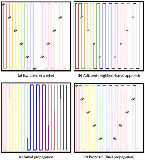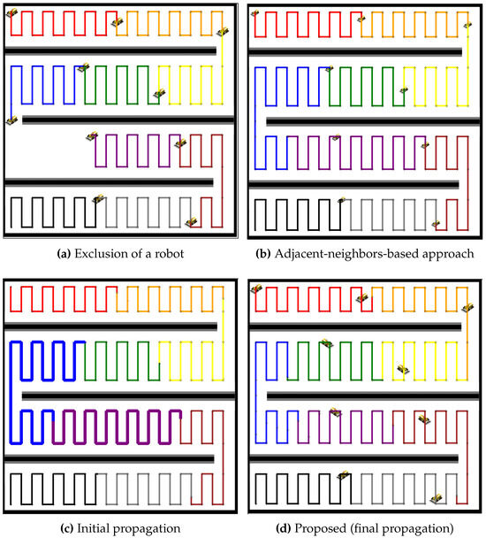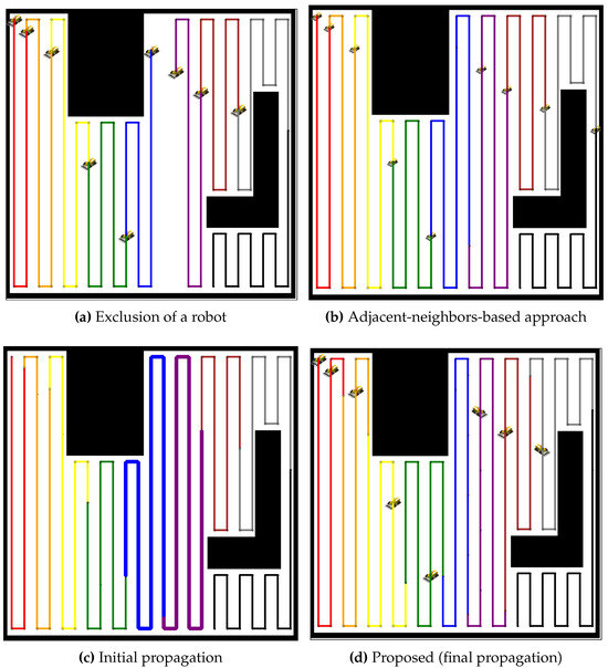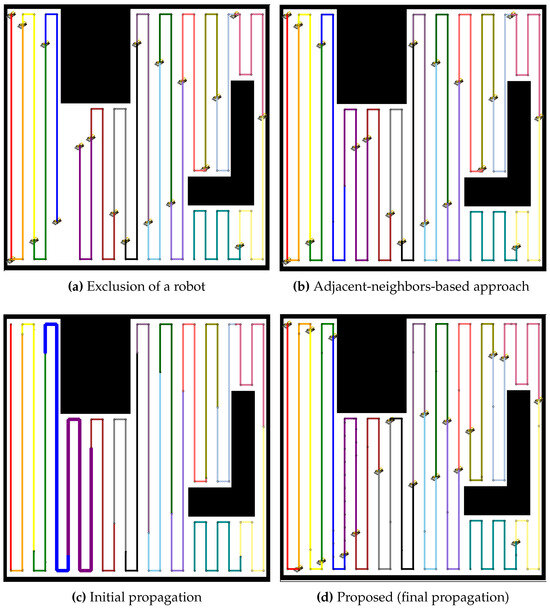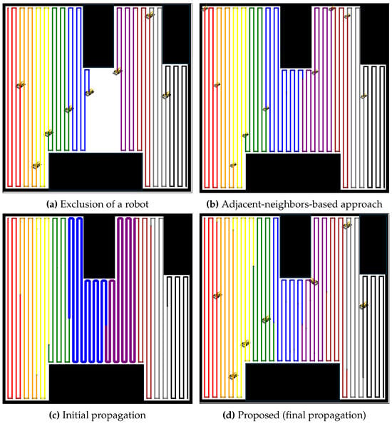 Conversely, the initial propagation of the proposed method, as shown in Figure 13c, shows some improvement as neighboring robots begin adjusting to cover the unoccupied coverage area, though imbalance still remains. By the final propagation stage (Figure 13d), the workload becomes well-balanced, with all robots contributing equally. This emphasizes the proposed method’s ability to achieve efficient coverage, even in lane-constrained environments where conventional approaches struggle to perform effectively.