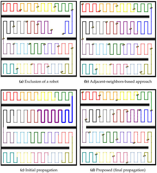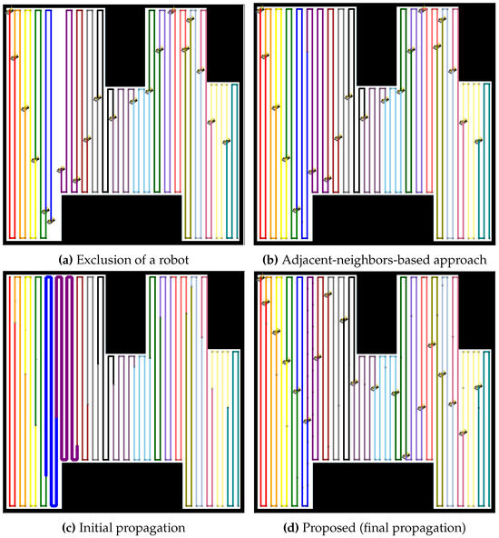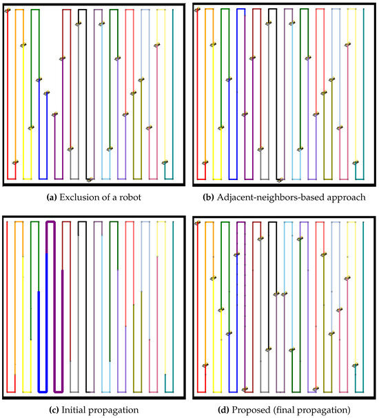 A similar analysis is applied to a larger team of 19 robots, as presented in Figure 10. The exclusion of a robot, as shown in Figure 10a, creates a coverage gap, and the adjacent-neighbors-based approach, as shown in Figure 10b, results in a suboptimal distribution of tasks. The initial propagation stage, as shown in Figure 10c, demonstrates that the proposed method begins to distribute the additional workload more effectively than the adjacent-neighbors-based approach. The final propagation stage, as shown in Figure 10d, illustrates that the proposed method achieves a balanced distribution, reducing the workload variance and maintaining coverage efficiency across the robot team.