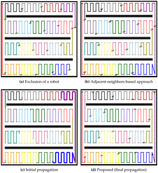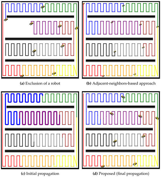 In the environment with two obstacles, the proposed method is compared to the adjacent-neighbors-based approach for redistributing the coverage tasks after a robot failure, as shown in Figure 9. The exclusion of the robot causes an imbalance in the coverage distribution, as shown in Figure 9a. The adjacent-neighbors-based approach, as shown in Figure 9b, reallocates the tasks but fails to achieve a balanced workload, as evident from the uneven coverage paths. However, the initial propagation stage, as shown in Figure 9c, of the proposed method shows a significant improvement, with neighboring robots extending their paths to cover the gap. By the final propagation stage, as shown in Figure 9d, the coverage paths are balanced, ensuring that all robots share the tasks equally, highlighting the efficiency of the proposed method over the adjacent-neighbors-based approach.