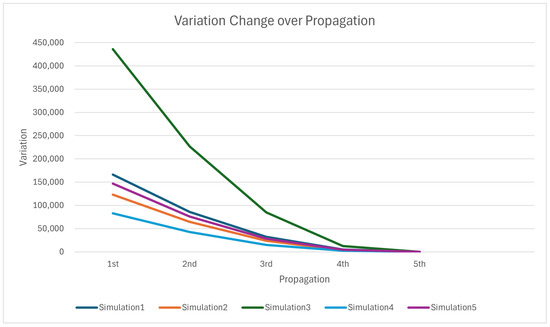 Variance in coverage path lengths according to the number of propagation executions for overall simulations.