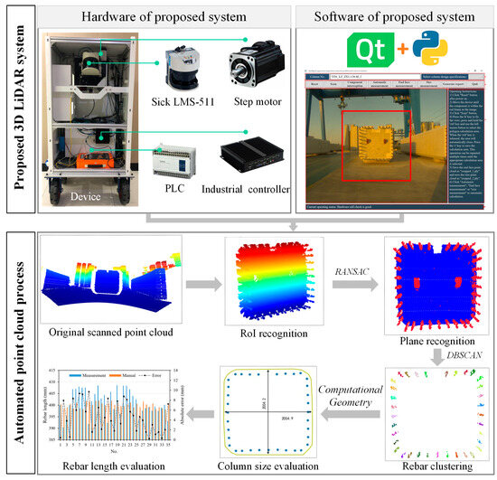 The overall framework of the system developed in this study is illustrated in Figure 1. The system consists of both hardware and software components. The hardware primarily includes a 2D linear LiDAR, a stepper motor, a PLC, and an industrial computer. The software, developed using Python, is implemented based on the third-party library named PyQt. The system is employed to scan prefabricated columns and capture their 3D point clouds. A series of point cloud processing tasks are performed using machine learning algorithms, ultimately enabling the measurement of the rebars and geometric dimensions of the column end face. Additionally, the system automatically generates a measurement report.