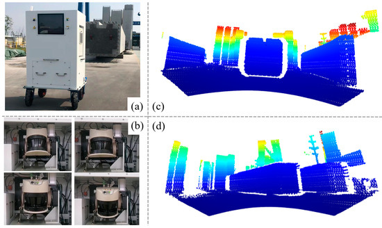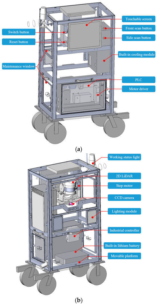 Given the inherent precision and sensitivity of the laser scanner, stringent considerations must be made regarding its working environment. Meticulous attention should be paid to avoiding direct exposure to sunlight and the erosive effects of rain. Therefore, it is imperative to establish the LiDAR system within a controlled and enclosed space that effectively mitigates the direct influence of external conditions. These measures are paramount for ensuring the sustained long-term functionality and reliability of the LiDAR apparatus. Considering the operational requirements of the TOF LiDAR, which involves the emission of laser pulses and the reception of corresponding reflected light signals, it is essential to ensure the LiDAR’s working surface with the open space. This critical step safeguards the integrity and accuracy of the emitted and received light, preventing undesirable interference or distortion in the data acquisition process. To facilitate the acquisition of point cloud data, the deployment of a wheeled platform trolley proves advantageous, enabling the LiDAR system to be conveniently positioned as needed. According to the above design concepts, the comprehensive design schematics of the device are presented in Figure 2a,b.