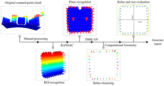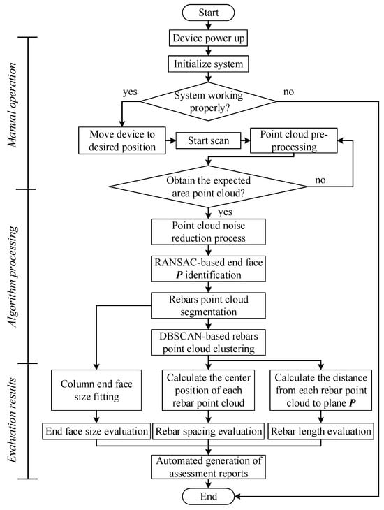 Finally, the point cloud data of each rebar are projected onto the column end face, and the RANSAC-based circle fitting method is employed to obtain the center point coordinates of each rebar. Subsequently, the determination of the rebar spacing can be accurately achieved through the computation of the Euclidean distance between the coordinates of the central points of adjacent rebars. Besides, to determine the length of the ith rebar, the projection distance di,j from the jth point Pi,j of the rebar to the plane P could be calculated. Then, the 2σ rule of normal distribution as a tolerance value was employed to estimate the rebar length. This statistical method helps to mitigate the impact of outliers and noise in the point cloud data, ensuring a more reliable calculation of the length. The overall procedure for automatic inspection of the column end face is illustrated in Figure 3.