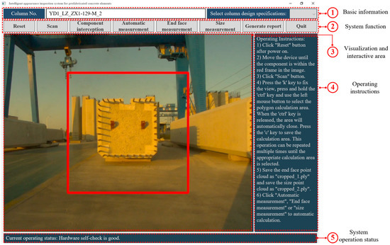 The proposed GUI involves five parts, which are basic information, system function, visualization and interactive area, operating instructions, and system operation status. In the basic information section, the system allows the user to input essential information regarding the column components, which facilitates the storage of data for distinguishing different as-produced columns. For the system functional section, the user has control over LiDAR scanning, point cloud processing, automatic calculation of column end face dimensions, rebar spacing and length, and the generation of reports. These functions form the core of the GUI and incorporate the algorithms discussed in Section 3.1. The GUI includes a visualization and interactive area to assist the user in positioning the device correctly for scanning. Additionally, it provides an interactive area for point cloud processing and the presentation of evaluation results. Clear operating instructions are provided to guide the user through the GUI’s operation, while the system operation status displays logs, alerts, and other relevant information.