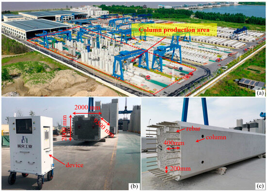 The examined case study pertains to an industrialized manufacturing facility located in eastern China, serving as a prominent example of large-scale production of prefabricated elements specifically designed for bridge columns, as illustrated in Figure 5a. The assessment of production quality for a selected column is conducted employing the developed column inspection equipment, as illustrated in Figure 5b. Figure 5c provides essential information regarding the fundamental dimensions of the column. The dimensions of the end face of the column are 2000 mm in length and 2000 mm in width. The top section of the column end face encompasses 35 pre-embedded rebars. The designed spacing between the rebars is approximately 200 mm, with an elongation length of 400 mm.