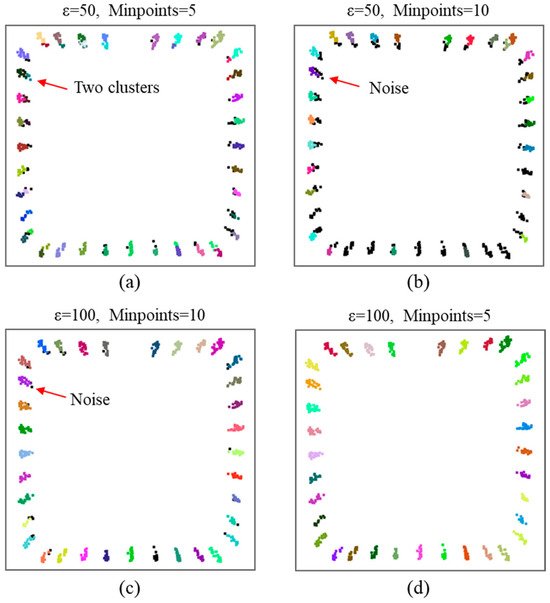 Rebars clustering results under different parameters: (a) ε = 50, Minpoints = 5; (b) ε = 50, Minpoints = 10; (c) ε = 100, Minpoints = 10; (d) ε = 100, Minpoints = 5.