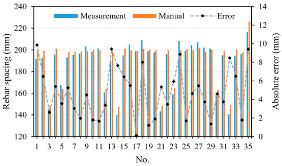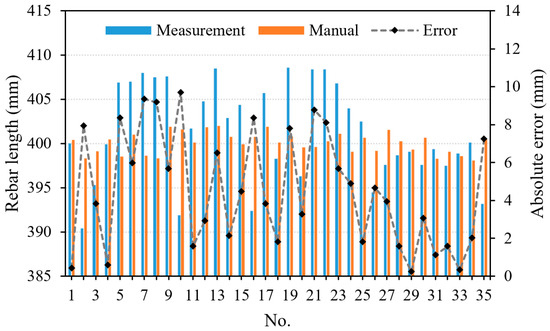 The detecting results of the column end face are 2004.2 (height) × 2004.9 mm (width). Compared with the proposed system with manual measurement results, the errors in height and width directions are 4.2 mm and 4.9 mm, respectively. The average error of the size of the column end face is 4.55 mm. The detection of rebar spacing exhibits a maximum discrepancy of 9.4 mm (illustrated in Figure 9), with an average discrepancy of 4.71 mm. The detection of the embedded rebar length indicates a maximum discrepancy of 9.7 mm (illustrated in Figure 10), with an average discrepancy of 4.54 mm. All of the aforementioned discrepancies satisfy the allowable error requirements for the design specifications [41,42], where the allowable tolerances for rebar spacing and length are required to be within 10 mm and 20 mm, respectively. The proposed system can be employed to swiftly and precisely assess the dimensional characteristics of prefabricated bridge columns on-site, replacing the conventional manual detection approach. As a result, it enhances the efficiency of on-site construction for prefabricated bridges and reduces costs associated with the inspection process.