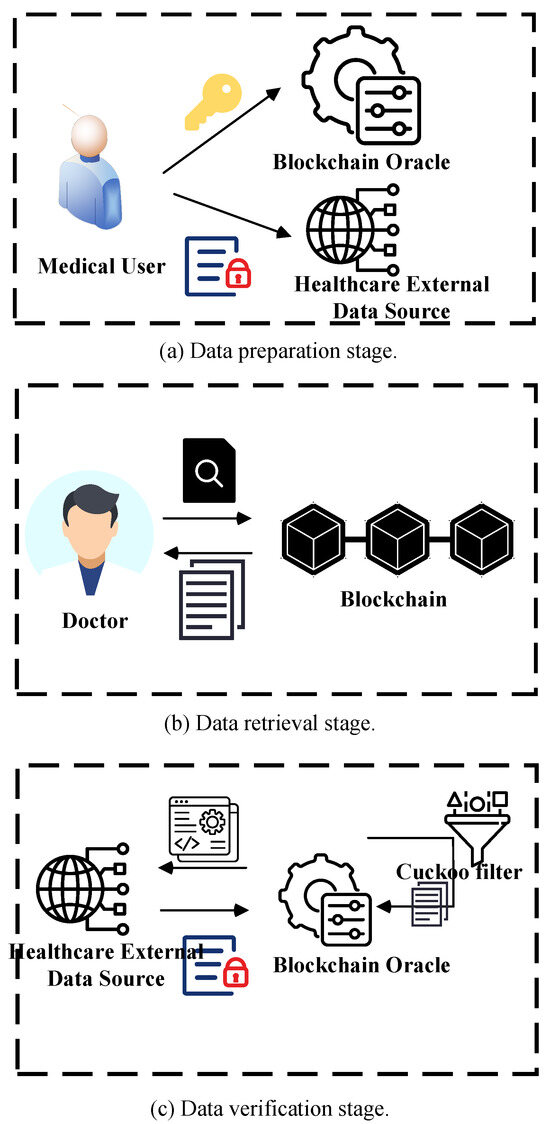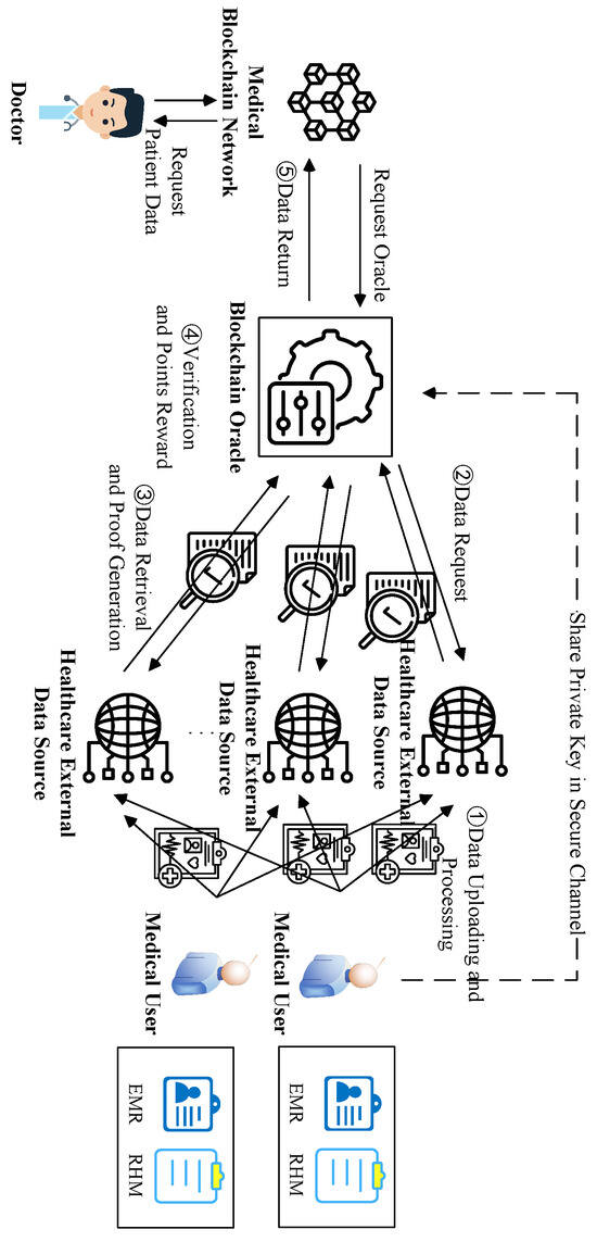 To ensure secure data transmission and precise application within the smart healthcare system, this study develops a system model for data retrieval integrity verification using a Blockchain Oracle and a multi-system data interoperability mechanism. The system model is illustrated in Figure 1, and the detailed process for data retrieval and verification in practical scenarios is outlined below.