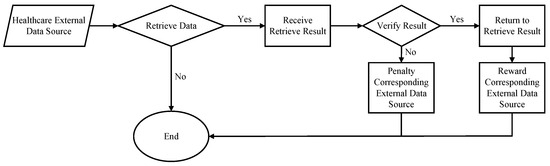 - Data RequestWhen doctors require access to specific medical data, they begin by submitting a data request to the medical blockchain network. Upon receiving this request, the network forwards a call request, including the identification details of the needed medical data, to the smart medical Blockchain Oracle. The oracle then formulates a retrieval request directed at an external medical data source, selecting the most reliable source based on the latest trust score to reduce the likelihood of data tampering or loss.