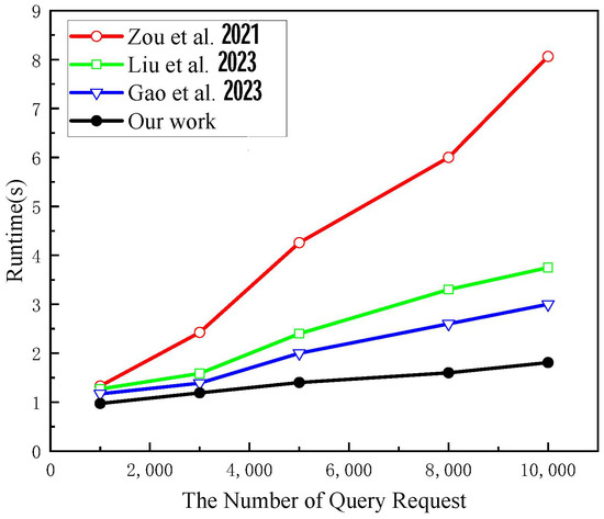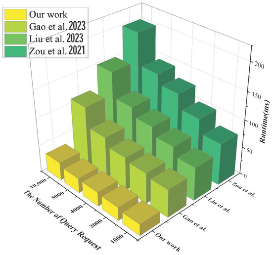 The query processing time mainly reflects the response speed of the system to the query request and the construction speed of the verification proof when executing the verification scheme. As shown in Figure 4, the SPChain system has a more substantial query processing time when locating EMR data through specially structured blocks but performs slightly worse when dealing with highly concurrent queries. MK-IPSE responds faster when dealing with multi-keyword queries, but the time overhead increases significantly when the keyword complexity is increased. Gao et al.’s scheme accelerates the query processing through edge computing though. However, the query processing time is still long due to bilinear mapping and power operation. This scheme shows significant advantages in query processing time. When performing 10,000 queries, the average query processing time of this scheme is only 1.8 s, which is about 48% less than MK-IPSE.
