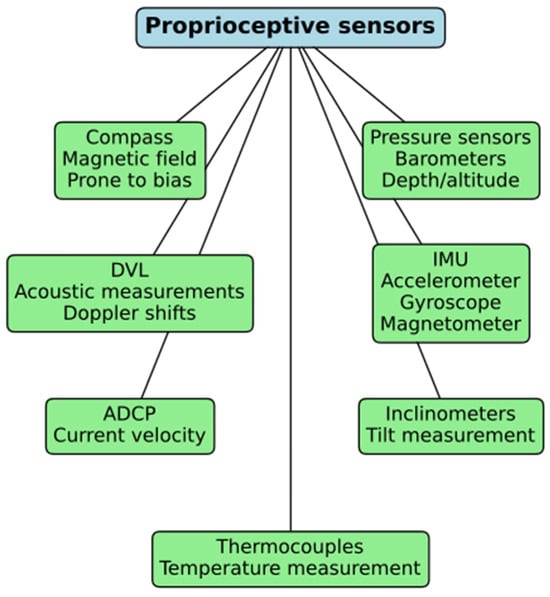 Figure 1 depicts the standard proprioceptive sensors utilized for underwater navigation. The sensors comprise compasses (susceptible to magnetic field interference); barometers (for depth assessment); DVLs for acoustic velocity evaluation; IMUs integrating accelerometers, gyroscopes, and magnetometers; acoustic Doppler current profilers (ADCPs for current velocity measurement); inclinometers (for tilt detection); and thermocouples (for temperature assessment). Every sensor enhances efficient underwater navigation and environmental awareness.