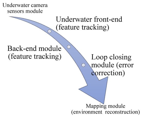 Figure 2 provides a visual depiction of an underwater SLAM system architecture, illustrating the sequential modules involved in feature tracking and environmental reconstruction. The system commences with the Underwater Camera Sensors Module, succeeded by the Underwater Front-End for feature tracking. The Back-End Module facilitates supplementary feature tracking, while the Loop Closing Module enables mistake correction. The procedure concludes with the Mapping Module, which is tasked with environment reconstruction, facilitating precise underwater navigation.