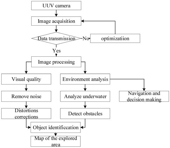 Data transmission begins after UUV camera picture acquisition, as in Figure 3. Image processing improves visual clarity, removes noise, and corrects distortions in transmitted data. After processing, the photos are used for environmental analysis, which comprises recognizing impediments, identifying items, and mapping the investigated area. The data are used for navigation and decision making.