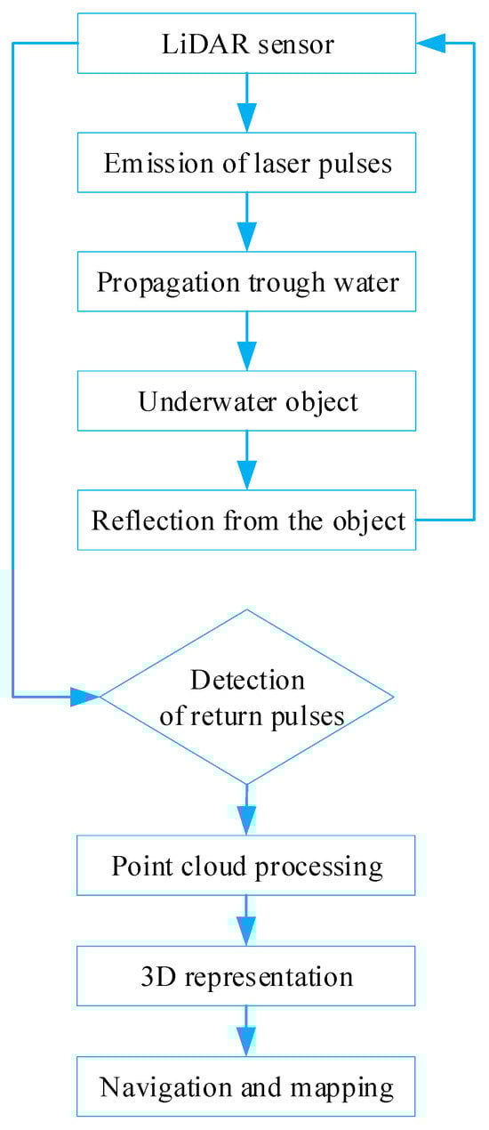 Figure 5 shows the underwater LiDAR system’s sequential operation. Laser systems are emitted, propagate through water, interact with an underwater object, and then are used for navigation and mapping. The LiDAR sensor detects and analyzes reflections to provide a 3D representation and navigational outputs.