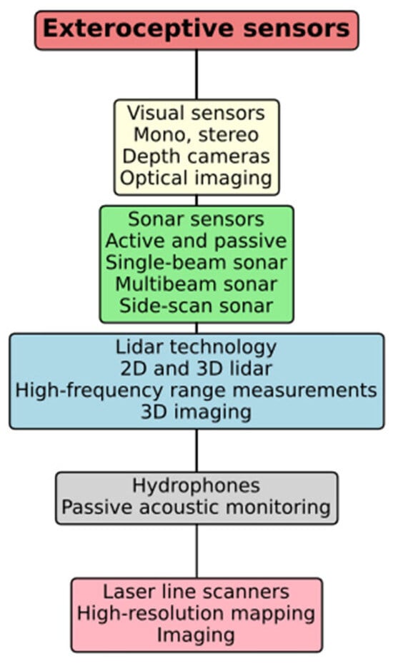 This graphic in Figure 6 classifies several types of exteroceptive sensors utilized in underwater settings. Visual sensors, sonar sensors, and LiDAR technology yield several data types, encompassing optical imaging, range measurements, and three-dimensional mapping. Hydrophones facilitate passive acoustic monitoring, whereas laser line scanners assist in high-resolution mapping and imaging. Each sensor type fulfills a distinct function in improving environmental awareness for underwater applications.