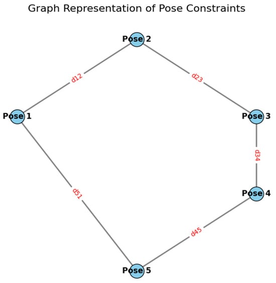 The objective of Graph-SLAM is to determine the arrangement of poses and landmarks that optimize the likelihood of the observed data while adhering to the limitations [,]. This procedure often entails optimizing a nonlinear least-squares cost function, which modifies the postures and landmarks to reduce the discrepancy between predicted and observed sensor values [,,].