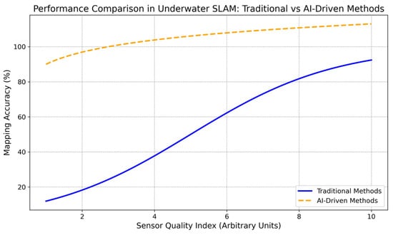 This work offers a comparative review of sensor fusion methodologies, including Kalman filters, Extended Kalman filters [], particle filters [,], and graph-based SLAM [,], emphasizing their efficacy in mitigating difficulties such as drift, signal degradation, and noise. We evaluate contemporary multimodal sensor fusion techniques that include IMUs, Doppler velocity logs, sonar, cameras, and LiDAR, providing improved resilience and precision in practical applications. Innovations in quantum sensing and artificial intelligence (AI)-driven [,,,,] adaptation filtering, including reinforcement learning and deep learning, are examined as potential transformative solutions for real-time adaptability in underwater environments.