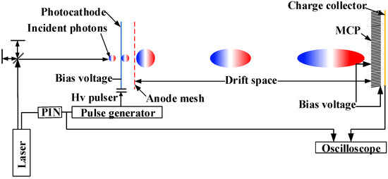 Prosser was the first to propose a technique for increasing the bandwidth of an electron detector by imparting velocity dispersion to the electron beam [13]. This technique converts short signals into longer time scales to slow down the probed signal, which improves the temporal resolution of the detector. Electron pulse dilation is a high-speed detection technique that can achieve a temporal resolution of several picoseconds. It is based on the principle of conversion of a signal of interest into a cloud of free electrons, which is accelerated into a vacuum drift space. The acceleration potential varies with time and causes the axial velocity to disperse in the electron cloud. This velocity dispersion is converted into temporal separation after the electrons pass through the drift space. Subsequently, the traditional time-resolved method is used to detect the free electrons, and the effective time resolution is “magnified” many times. In the past decade, different diagnostic instruments have been developed that use electronic pulse dilation technology to achieve temporal resolution in the range of 5–30 ps [14,15]. The driving force behind these development efforts is the demand for advanced diagnostics in high-density physics experiments carried out around the world.