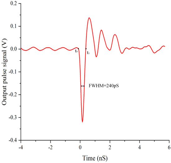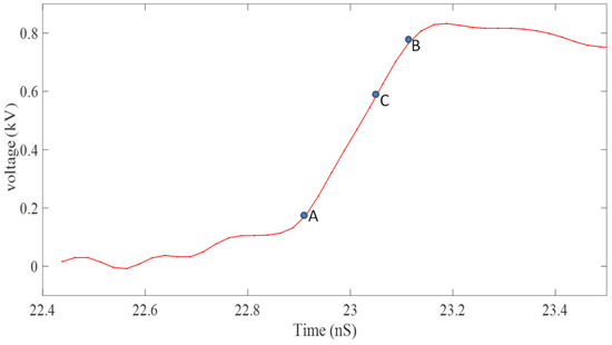 The high-voltage dilation pulse generated by the avalanche tube circuit is loaded onto the microstrip cathode through an impedance gradient line [18,19]. The pulse waveform is shown in Figure 2, with a time of approximately 180 ps from point A to point B, a voltage of approximately 540 V, and a slope of approximately 3.0 V/ps.