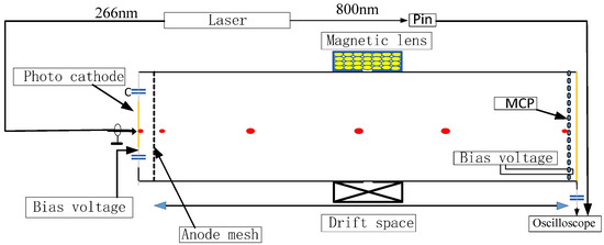 Ultrafast diagnostic equipment is an indispensable research tool in cutting-edge scientific research and technology [1,2,3]. Inertial confinement fusion (ICF) occurs under extreme conditions such as extremely short time (~10−9 s), extremely small space (0.1–1 mm), extremely high temperature (100 million degrees), and extremely high density (300 g/cm3). Therefore, it can only be detected using diagnostic equipment. This equipment will help in developing diagnostic techniques under extreme transient conditions, using more advanced diagnostic techniques to study previously unexplored scales of pressure, temperature, time, and space, providing strong technical support for more precise research on physical problems, and promoting progress in physical understanding [4,5]. X-ray measurement equipment used in ICF experiments includes photoconductivity detectors, thermoelectric detectors, and X-ray diode detectors. Out of these, vacuum photodiode detectors are preferred because of their fast response time, high reliability, and convenient sensitivity calibration. A reflective photodiode is a common type of vacuum photodiode detector that mainly uses X-rays to traverse the mesh anode, irradiate the cathode, and generate photoelectrons. The photoelectrons return to the anode after acceleration by a DC electric field, thus generating a pulse current in the output circuit to produce an electrical pulse with a time resolution of tens of ps. The photodiode used by the Lawrence National Laboratory in the United States has the fastest response time of about 50 ps, while that used in Shenguang III has a response time of about 55 ps [6,7]. Such conventional diagnostic techniques cannot meet the requirements of high temporal and spatial resolution and wide dynamic ranges. In ICF, implosion burn widths are typically 150 ps and are expected to drop as performance improves [8]. For adequate characterization of the dynamics near stagnation, detectors with a temporal response in the order of 10 ps are required. There are two main ways to improve the time resolution of the detection signal: one is to improve the time resolution of the detection equipment itself, and the other is to improve the time resolution of the detection device by using pulse dilation technology to broaden the detected signal in space. This limitation has motivated researchers to not only optimize the traditional ultrafine diagnostic technique but also explore and invest in its innovation. In particular, the application of the electron pulse dilation technique in PMT has significantly improved its time resolution capability [9,10,11,12]. This technique enables high-speed detection by converting incoming signals into free-electron clouds and manipulating electronic signals using electric and magnetic fields.