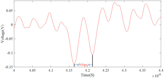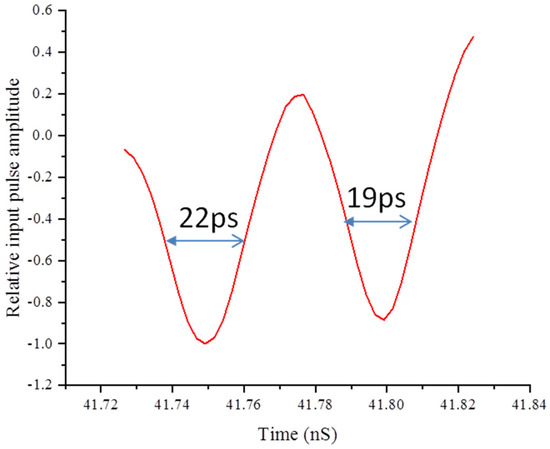 Figure 8 depicts the result of reconstructing the output signal; the recompression FWHM of the first dilation peak is 22 ps. The width of the second peak after compression reconstruction is about 19 ps. Compared with the FWHM of the pulse in Figure 3, it can be seen that its time resolution has been improved about 12 times. The amplitude ratio of the two pulses after decompression is about 1:0.88, which is considerably different from the ratio of 1:1 for the input pulse. After analysis, the following sources of error are identified: