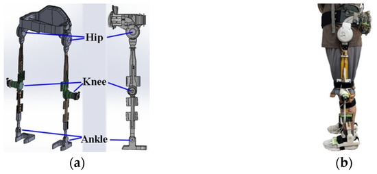 (a) Design of robotic hip–knee exoskeleton. (b) Building and wearing of proposed robotic knee–hip exoskeleton.